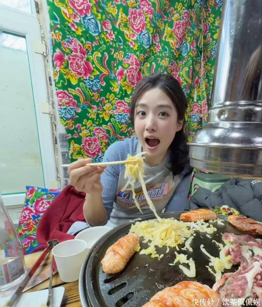 玩累了还打卡了东北特色美食,走进地道餐馆里,满满一桌烤肉香气扑鼻,超有食欲。她拿起筷子夹起食材的瞬间,眼睛亮晶晶的满是惊喜,脱掉厚重外套后,纤细苗条的身材超吸睛,背后的花布帘透着浓浓的东北烟火气,画面鲜活又治愈,满是生活质感,吃得开心又满足。