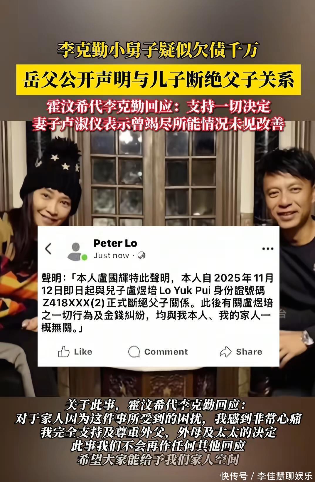 近日,李克勤因公开支持岳父与妻弟断绝关系,引发舆论哗然。